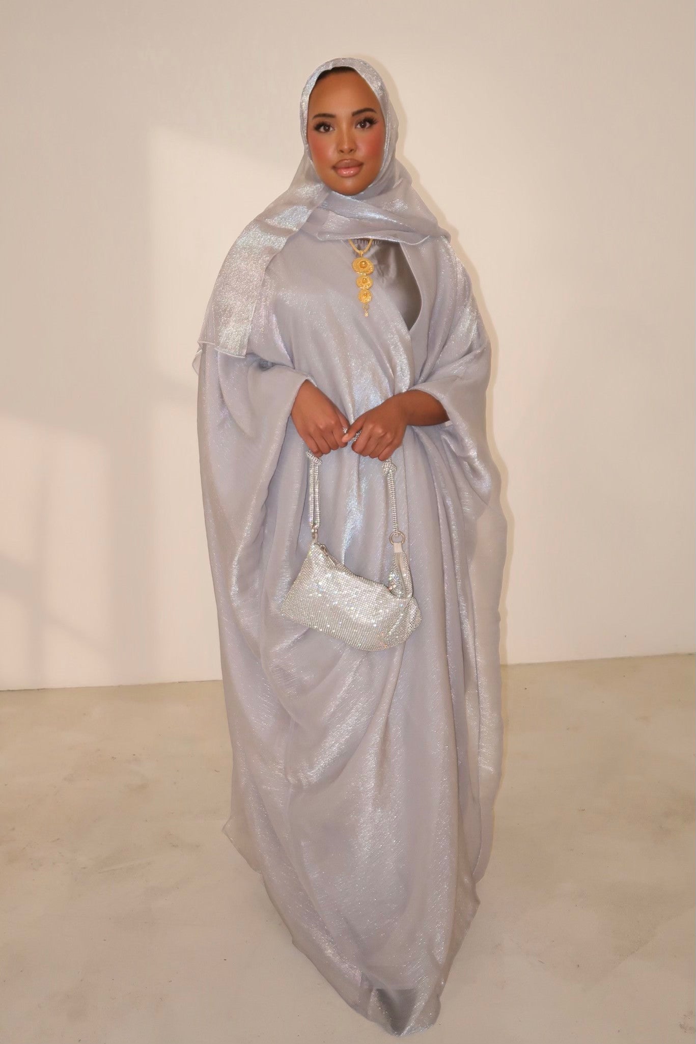 ✨ A flowing organza abaya with a mesmerising shimmer, designed with a puff sleeve adding a touch of luxury to your look.